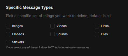 Bulk Delete Specific Content Types: You can select any combination of message types based on the type of content they contain. For example, you can delete all Images and Videos from your Discord Server, or all messages containing Links.