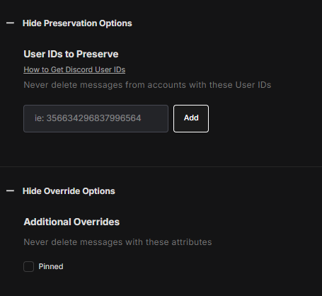 Preserve messages and mass delete the rest: If you’re looking to purge all Discord messages from your server, except for pinned messages – just tick the relevant override box. You can also add User IDs to preserve any messages sent by specific users – for example, yourself as the moderator, or Discord bots you’re using.