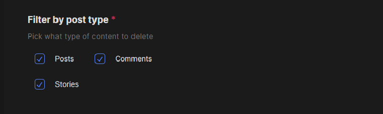 Filter by date range, album name, caption keywords, tagged users, and media type. Add whitelists for albums or words that you want to protect during cleanup.