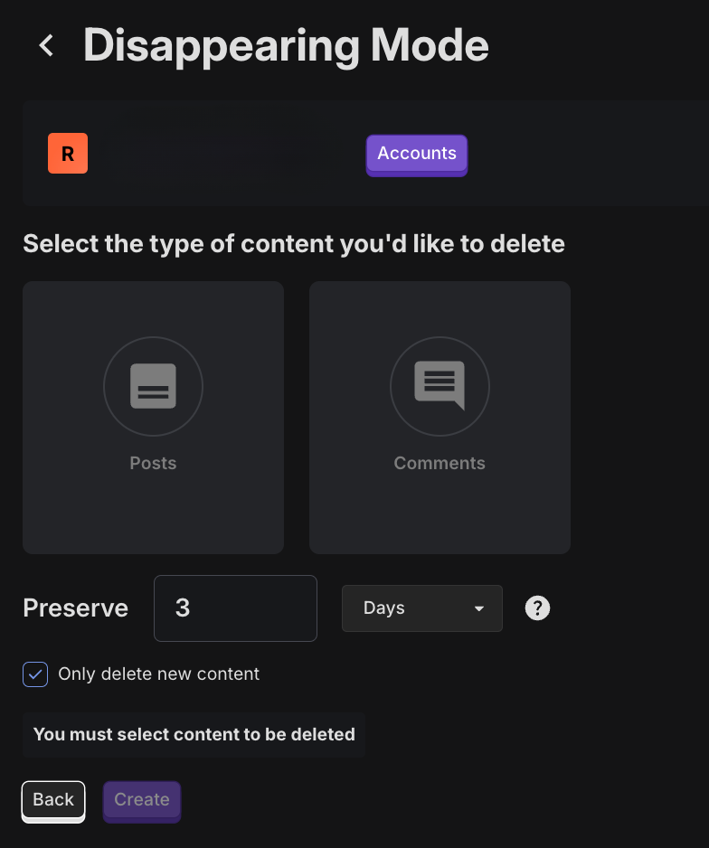 Disappearing Mode is a powerful automatic deletion feature that lets you decide how long your Reddit activity stays online before being permanently removed. You can fully control which types of content get deleted, how long you want to keep them, and when they vanish.