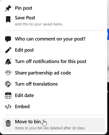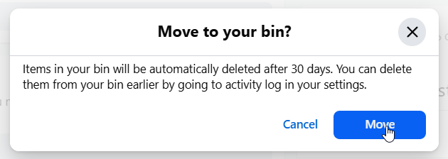From the dropdown menu, select Move to bin, then hit the Move button to confirm it. Facebook will move the post to the Page’s bin, where it will stay for 30 days before permanent deletion.