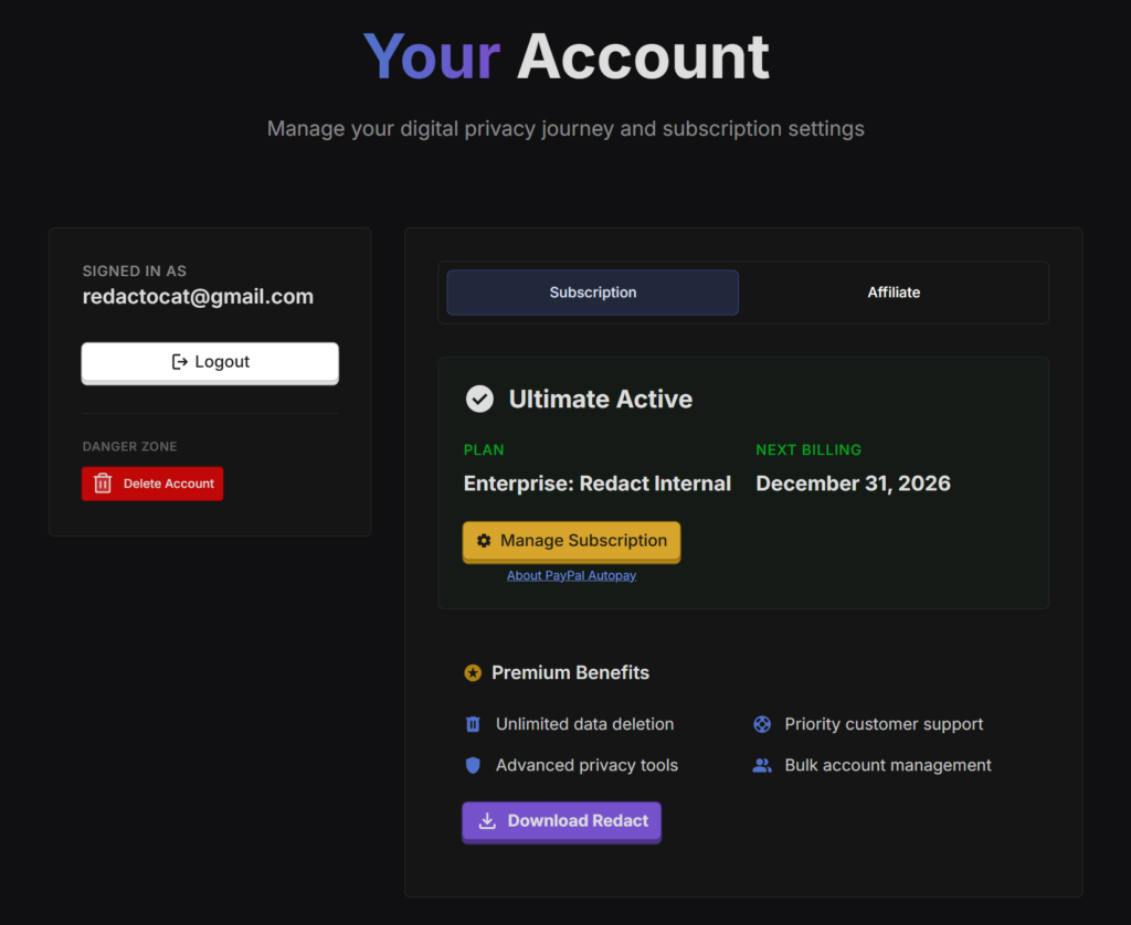 If you are looking for clear steps on how to delete your Redact account, you are in the right place. At Redact, we value your privacy and believe you should always have full control over your personal data and digital footprint – that’s why we’ve made deleting your account as easy as possible.