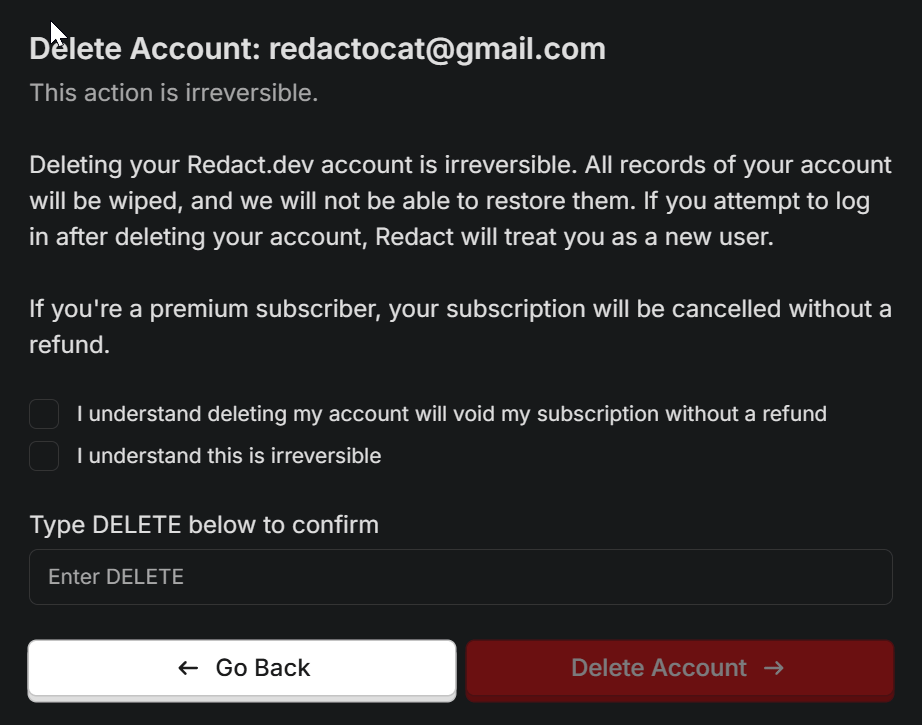 You will need to check the required boxes to confirm that you understand deleting your Redact account will cancel your subscription without a refund and that the account deletion process is irreversible.