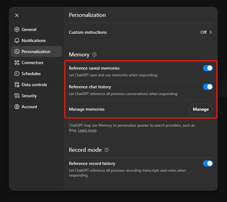 • Review History & Personalization settings and Memory controls. Turn them off or adjust them if you do not want future chats saved or referenced.