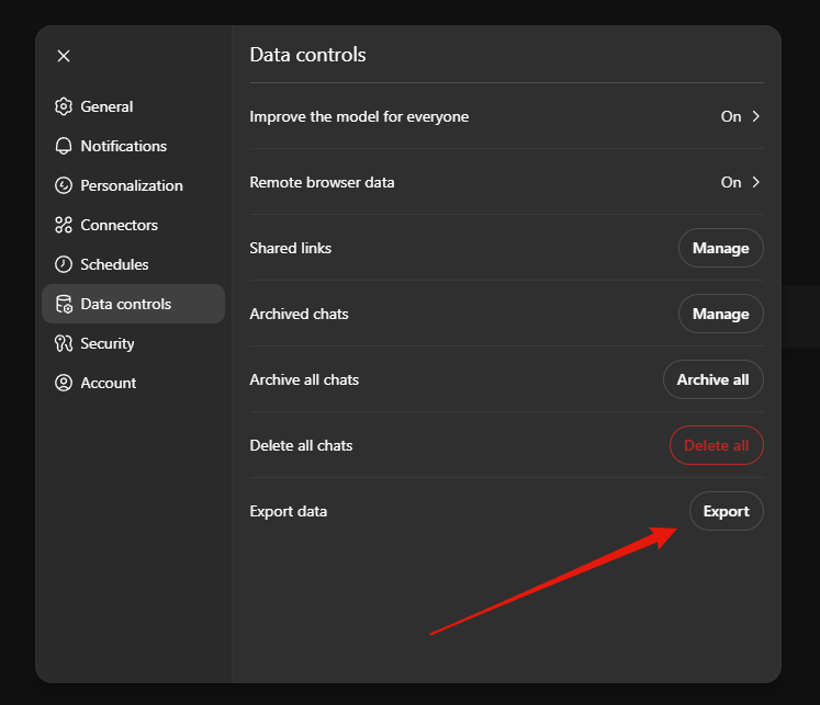 1. Log in to ChatGPT, open your profile menu, choose Settings, then Data Controls, then Export Data.