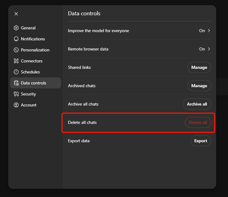 Important: Deletions are permanent and cannot be undone. OpenAI schedules deleted chats for permanent removal from its systems within about 30 days, with limited legal or security exceptions.