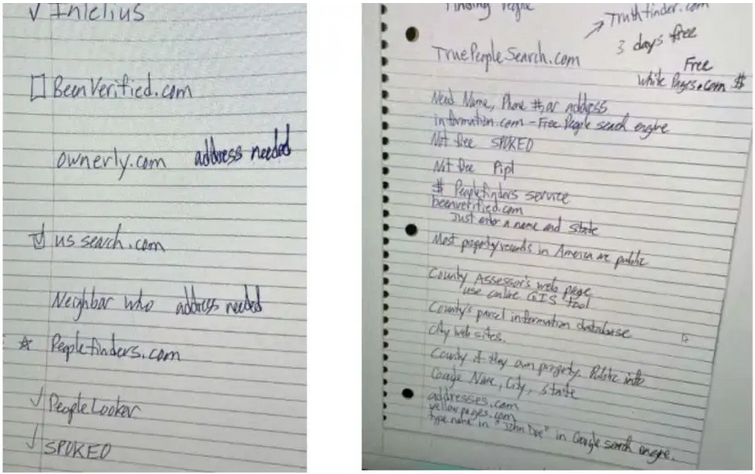 This notebook page of Boelter’s has been widely reported on in the media. It’s not just a scribble – Boelter is listing our online directories and people search sites that he used to gather data on his victims. Relatively well-known data brokers like Intelius, BeenVerified.com, and Spokeo contain millions of records. If you’re a US citizen, there is a good chance you’re already listed on these sites.